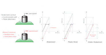 Let’s consider, for example, a fully pressurized pressure vessel with a load applied on the nozzle as shown in the picture. This load creates a bending stress (secondary stress) at the nozzle-to-head juncture. In the left-hand side of the nozzle, this load creates a tension strain value ε1 (see below), somewhat beyond the yield strain […]
